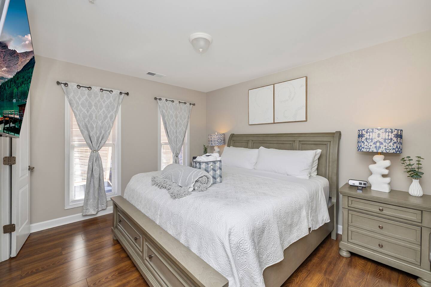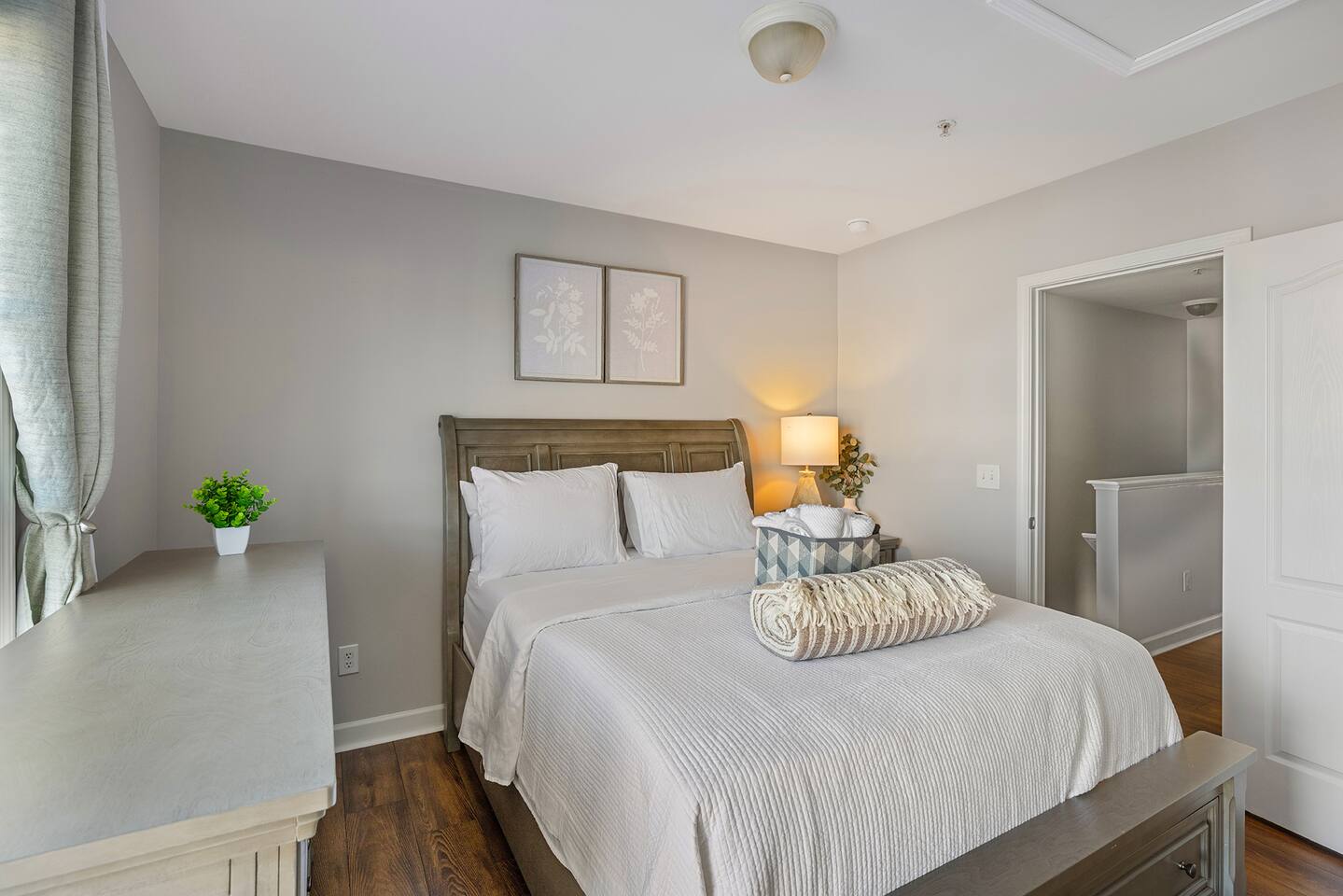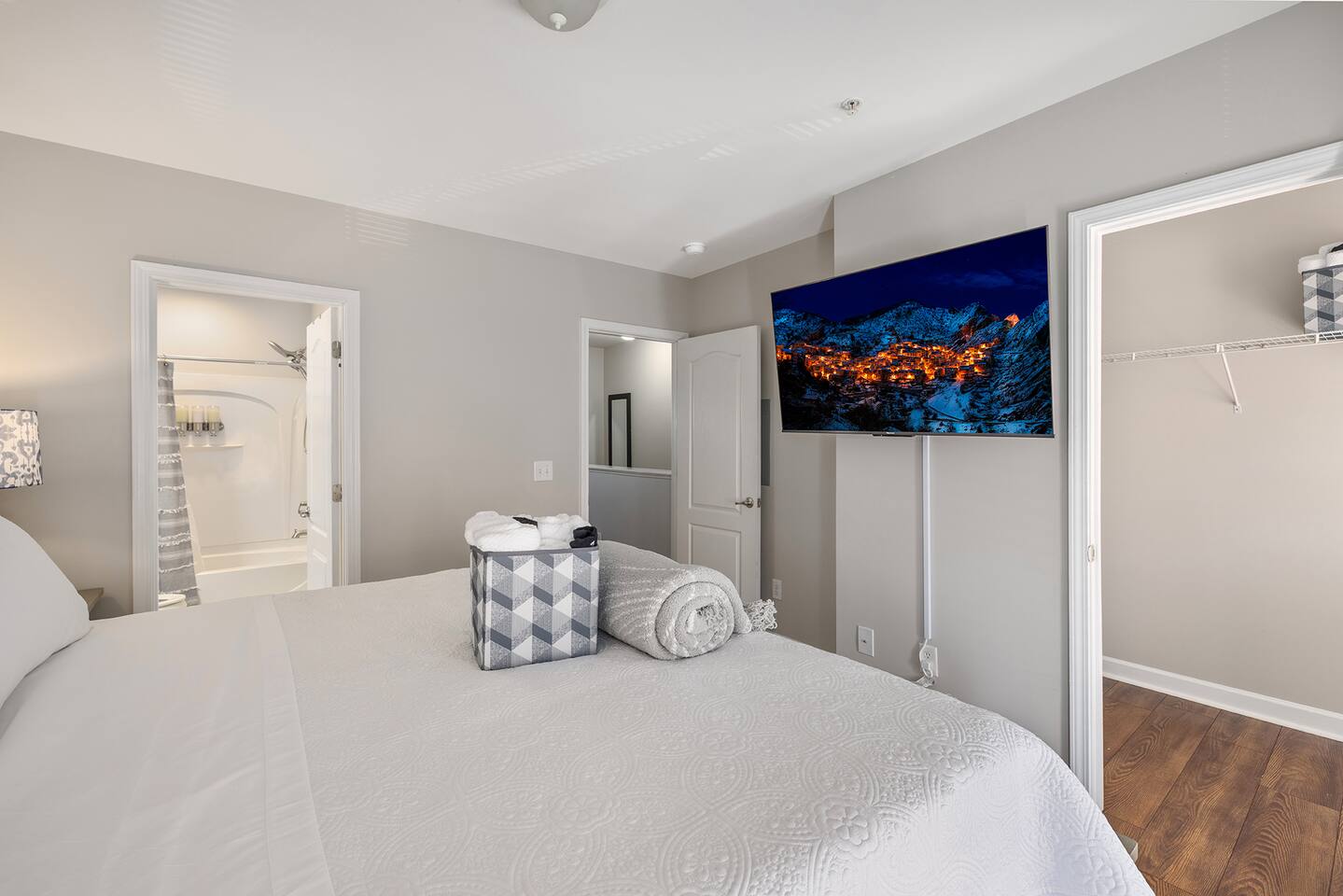 Bedroom 1: King bed . blackout shades . Smart TV . premium bedding Bedroom 2: Queen bed . Smart TV . cozy quilts Living area: Rollaway bed available and set up for your 5th guest Bathrooms: 2.5 baths ,dual tub/shower, premium toiletries, hairdryer, magnifying mirror
